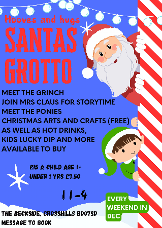 EVERY WEEKEND IN DECEMBER 🎅🎄🤶 See santa in his grotto at the beckside garden in crosshills, meet the ponies, but watch out for the cheeky grinch hiding round the corner. Grab a hot chocolate and sit with mrs claus for storytime. Don't forget to get crafty with your Christmas decoration at our art and crafts table. Go on a hunt around the garden and find clues to claim a prize! There will also be a lucky dip, balloons and a hooves and hugs stall. BOOKING ONLY MESSAGE TO BOOK 07895774259